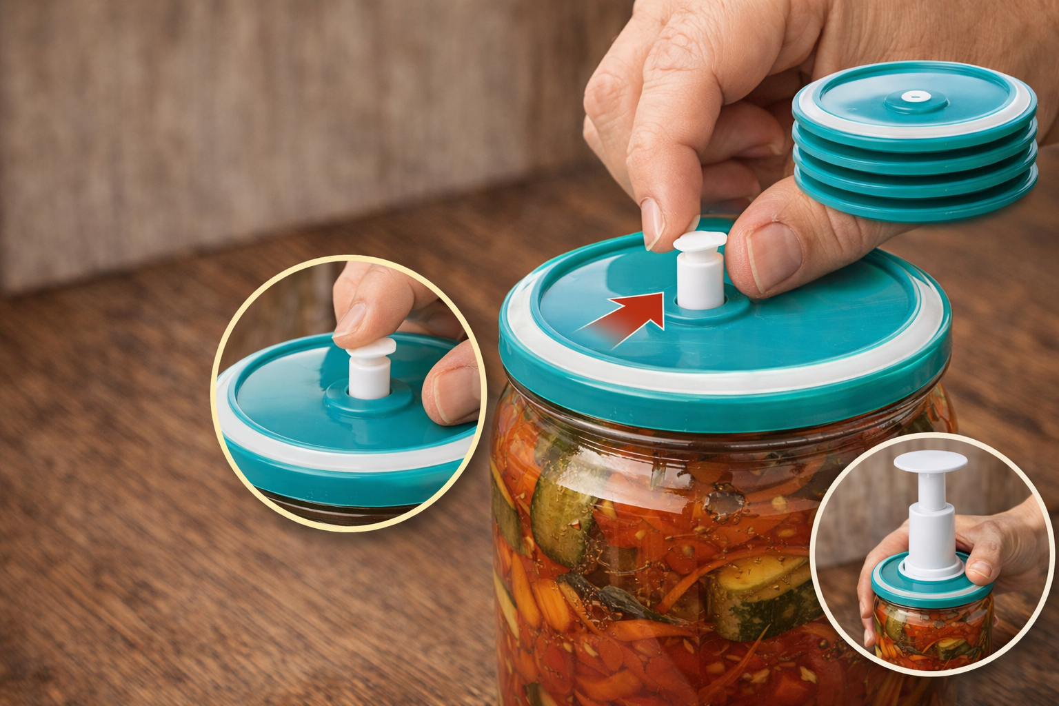 Для этого не нужны дополнительные приспособления или инструменты. Нужно просто приоткрыть клапан, который в середине крышечки. Воздух пойдет внутрь емкости, и она легко приоткроется. Удобно, что с помощью специального насоса легко снова закрыть банку герметично.