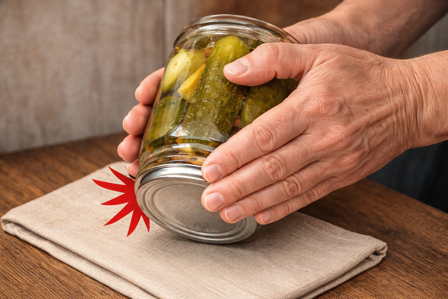 Также можно просто прокатить крышку по краю твердой поверхности с небольшим нажимом. Крышка немного изогнется, можно будет услышать негромкий хлопок. Теперь стоит пытаться вскрыть емкость.
