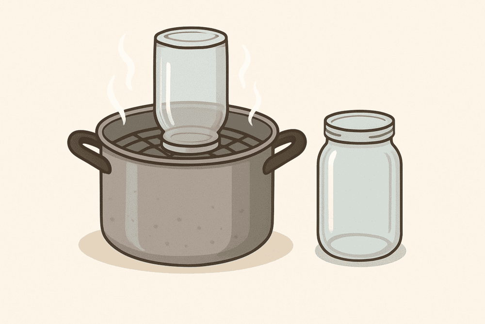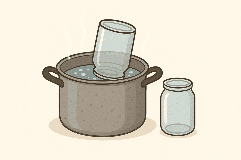 Банку ставят на решётку или непосредственно на кастрюлю с кипящей водой горлышком вниз.